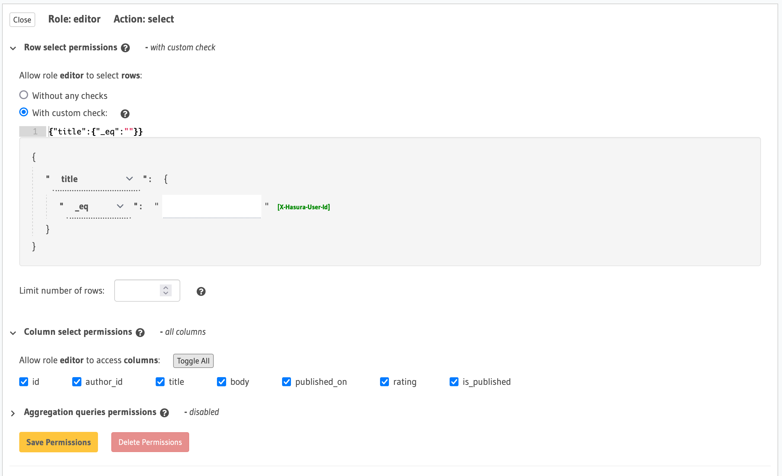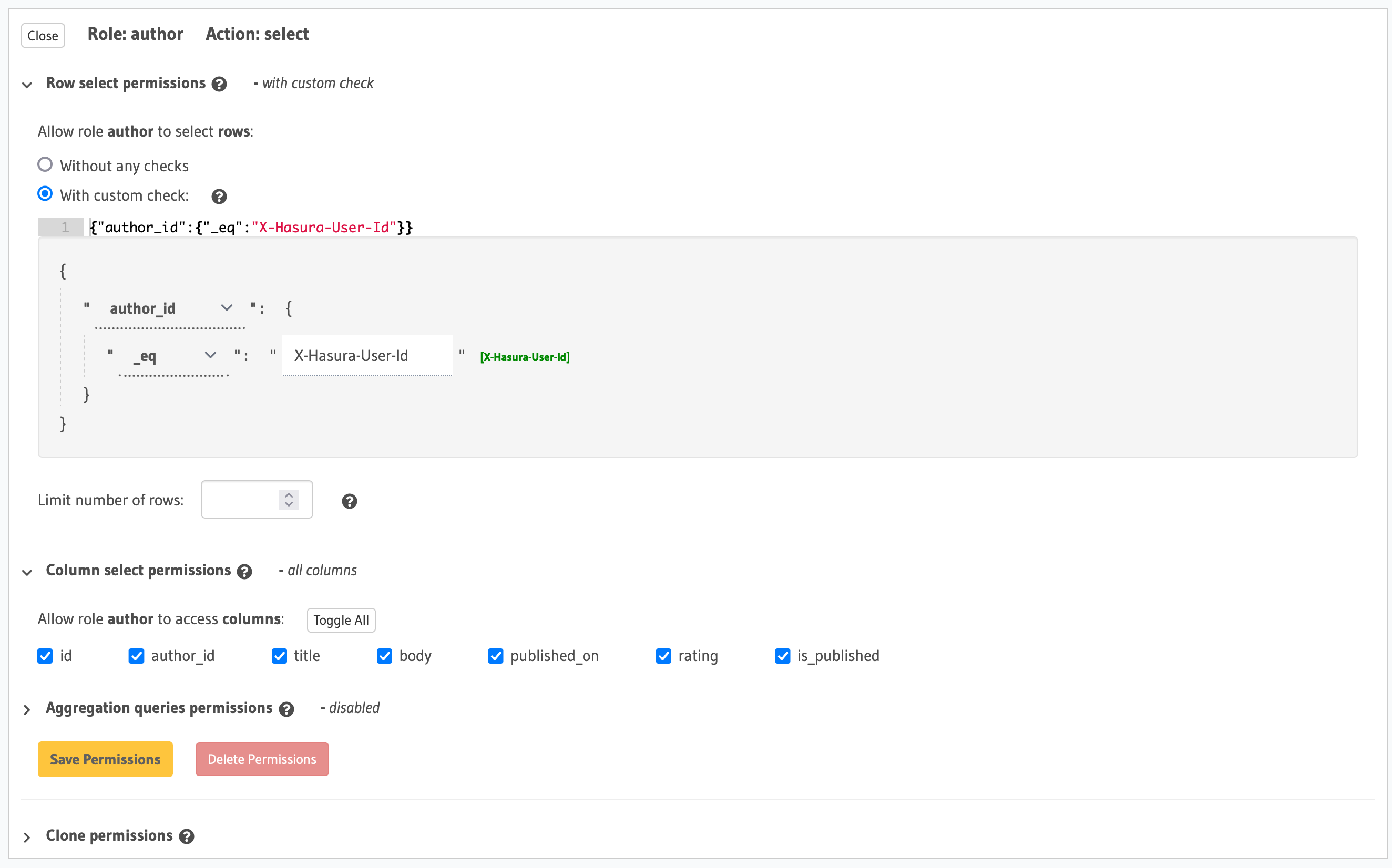 Example 2: Validate that author roles can only select an article if the author_id matches X-Hasura-User-Id